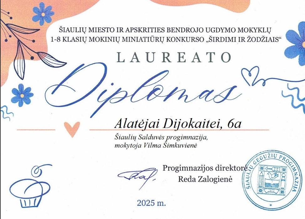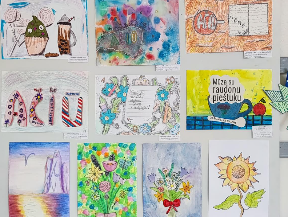 Gegužių progimnazijoje organizuotoje Lietuvos bendrojo ugdymo mokyklų atvirukų – miniatiūrų parodoje – konkurse „Širdimi ir žodžiais“ dalyvavo 148 mokinių darbai. Sveikiname 6a klasės mokinę Alatėją Dijokaitę, kuri už savo piešinį pelnė laureato diplomą.