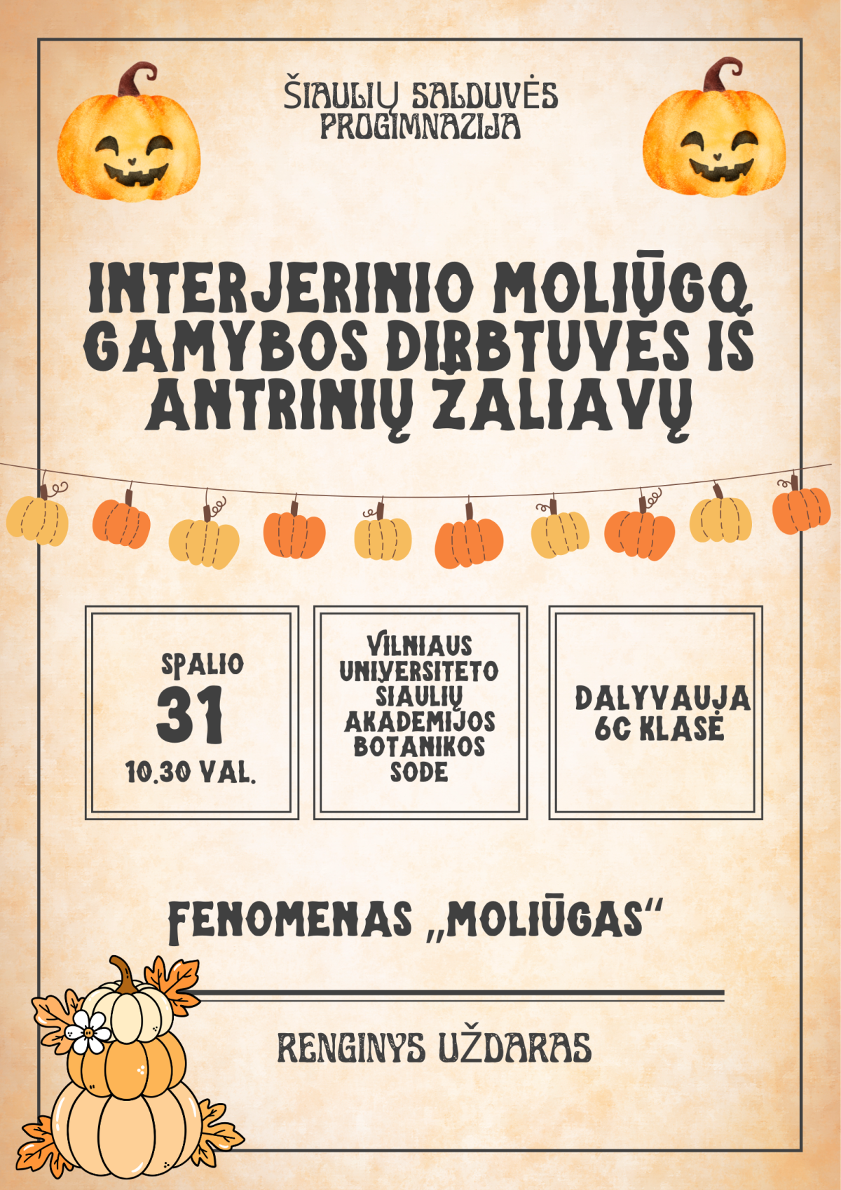 6c klasė spalio 31 d. dalyvaus Vilniaus universiteto Šiaulių akademijos botanikos sodo interjerinio moliūgo kūrimo dirbtuvėse iš antrinių žaliavų. Tai yra mokinių fenomeno „Moliūgas“ tyrinėjimų dalis.