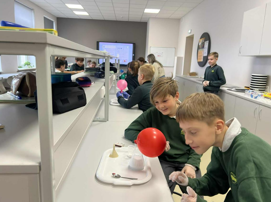 Spalio mėnesį Salduvės progimnazijos ketvirtokai tęsė pažintį su naująja gamtos mokslų laboratorija. Šįkart mokiniai tyrinėjo medžiagų kitimus ir aiškinosi, kurie jų yra grįžtami, o kurie – negrįžtami.