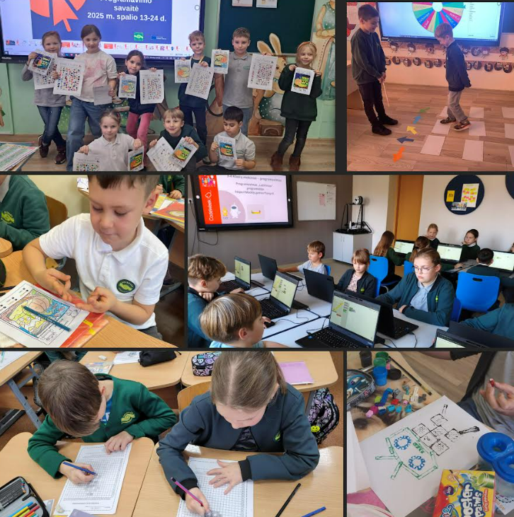 Veiklų metu mokiniai sužinojo įdomių faktų apie programavimą ir jo svarbą šiuolaikiniame gyvenime, kūrė pikselių meno piešinius, dalyvavo kūrybinėje veikloje „Lego anspaudai“, sprendė koordinačių žaidimo užduotis, išbandė programavimą „Blocky“ programoje.