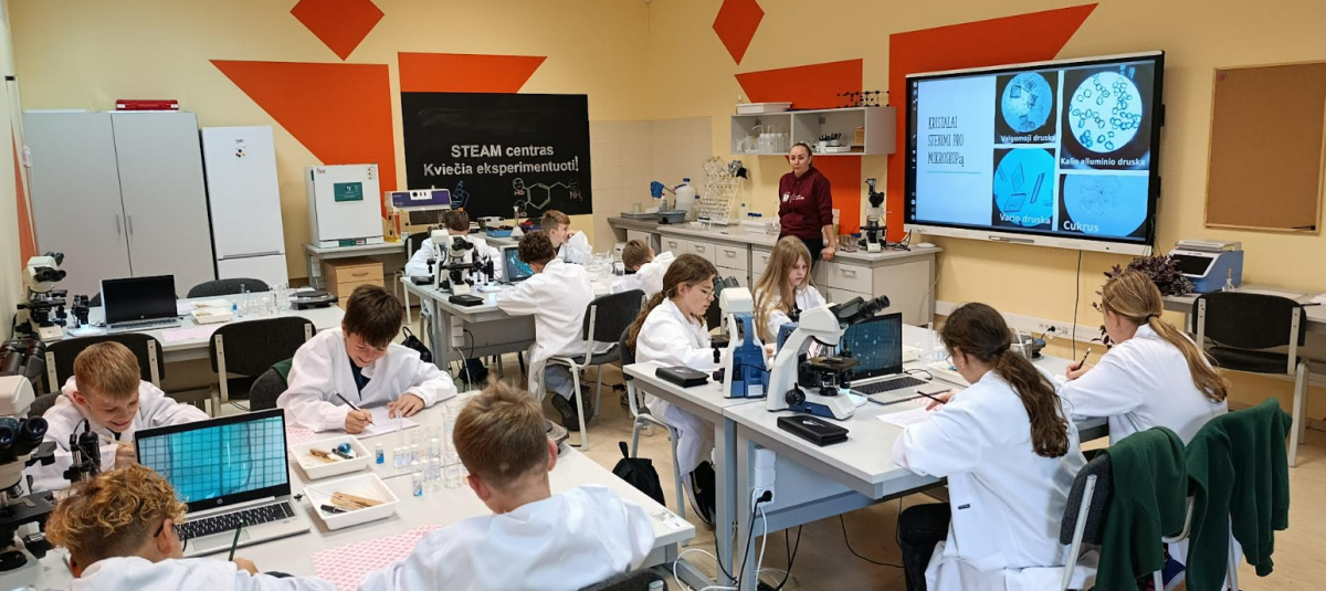 Antrokai leidosi į mikropasaulio gelmes – smalsios akys tyrinėjo tai, kas plika akimi nematoma. Trečiokai virto tikrais mažaisiais detektyvais – jų misija buvo sekti temperatūrų pokyčius. Ketvirtokai pasinėrė į optinių žaislų istoriją – o svarbiausia, patys kūrė spalvingą, dekoruotą sukutį. Penktokai tyrinėjo mikrokristalų grožį bei atrado 3D pasaulio paslaptis. Šeštokai programavo mikrobitą, o kita grupė tapo tikrais mokslininkais, kurie kūrė savo dinamometro skalę, atliko matavimus, braižė ir analizavo rezultatus. Septintokai gilinosi į žmogaus kūno paslaptis – tyrinėjo dirbtinį inkstą. Kita grupė kūrė cheminę mozaiką – spalvingą, kūrybingą, tarsi laboratorinis paveikslas. Aštuntokai tapo jaunaisiais inžinieriais – konstravo roboto-mašinėlę, ją programavo ir patys valdė.