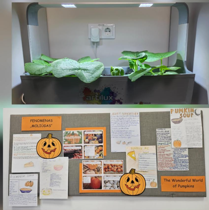 Gamtos ir žmogaus pamokose mokiniai tapo tikrais tyrėjais. Jie nuodugniai gilinosi į moliūgo gyvenimo ciklą ir sandarą, tyrinėjo vaisius bei sėklas, stebėjo jas pro lupas. Svarbiausia dalis buvo praktinė: pasėję sėklas, jie beveik mėnesį vykdė augimo stebėseną – matavo daigų aukštį, fiksavo pokyčius ir stebėjo augalų konkurenciją dėl išteklių. Taip mokiniai praktiškai suvokė dygimo, augimo ir prisitaikymo procesus.