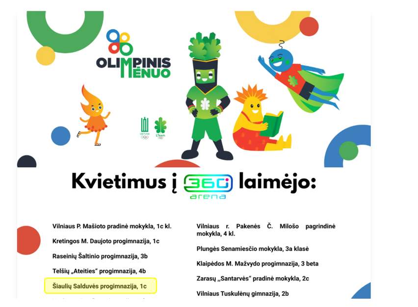 2025 m. lapkričio 10 d., burtų keliu, buvo išrinkti „Olimpinis mėnuo 2025" projekto prizininkai. Projekto globėja pirmoji ponia Diana Nausėdienė paskelbė net 30 prizininkų, tarp kurių pateko ir Salduvės progimnazijos 1c klasė! Mokytoja Lina Sačenko.