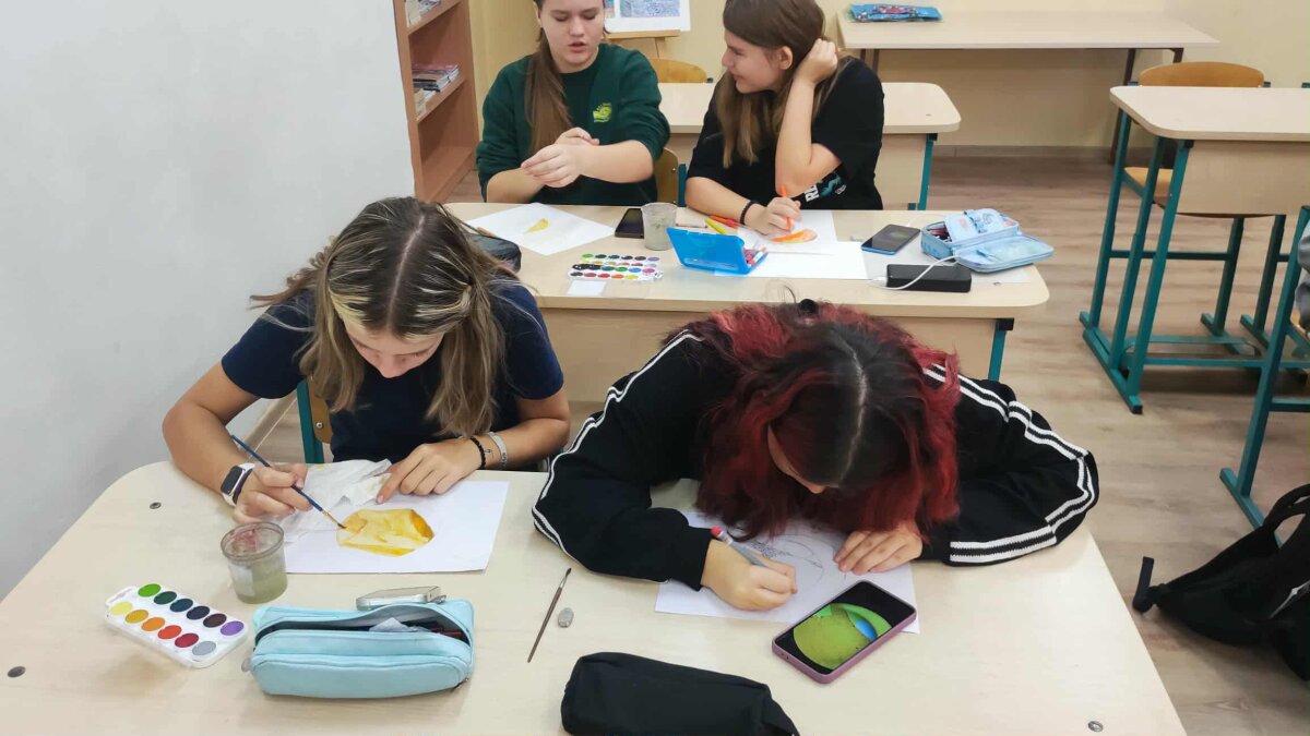 Pamoka buvo integruota su daile – dailės pamokoje mokiniai kūrybiškai piešė tai, ką matė pro mikroskopą.