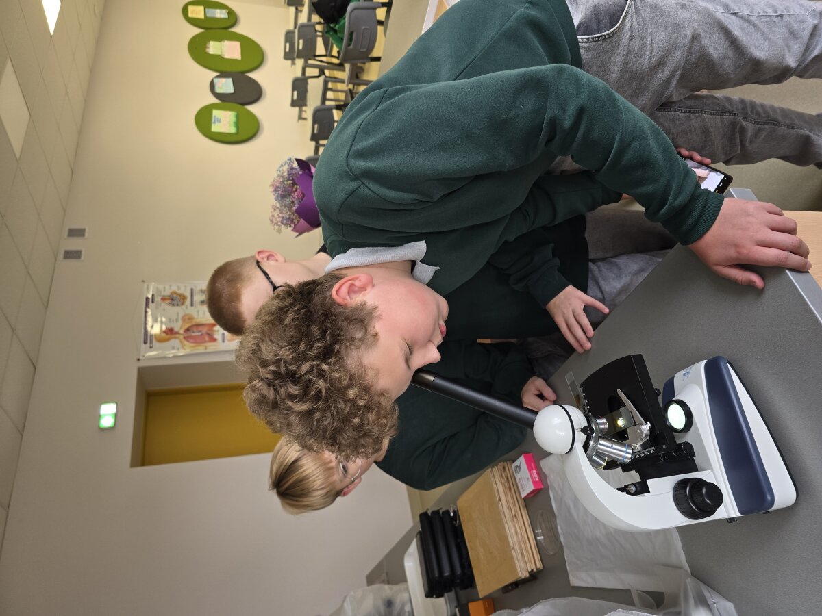 Biologijos pamokoje septintokai atliko laboratorinį darbą, kurio metu tyrinėjo augalo ir gyvūno ląsteles. Mokiniai patys paruošė laikiną svogūno dengiamojo audinio preparatą, jį stebėjo pro mikroskopą ir lygino su varlės kraujo ląstelėmis.