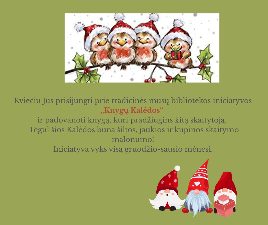 Šventės – tai metas, kai širdis švyti nuo mažų gerumo gestų. Kviečiu jus prisijungti prie tradicinės mūsų bibliotekos iniciatyvos „Knygų Kalėdos“ ir padovanoti knygą, kuri pradžiugins kitą skaitytoją.