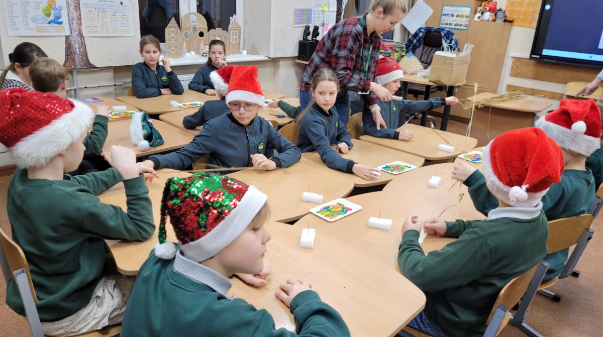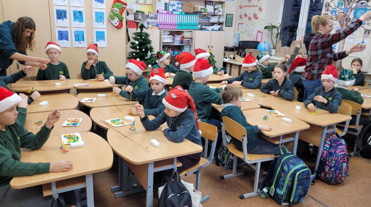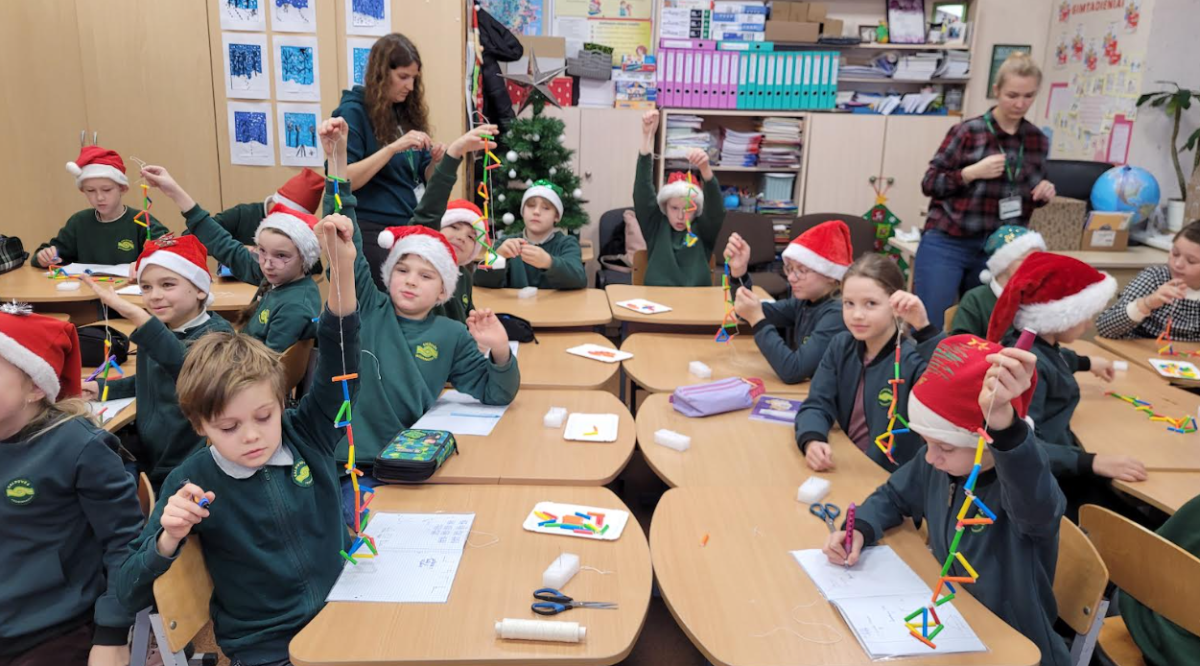 3b klasės mokiniai dalyvavo integruotoje pamokoje, kurios metu jungėsi matematikos ir technologijų žinios, kūryba bei Kalėdų laukimo džiaugsmas. Pamoką pradėjo mokytojas Gintaras, papasakojęs vaikams apie sodo vėrinius iš šiaudų, jų tradicijas bei paskirtį, taip pat apie duonelės kepimą iš įvairių grūdų. Vaikai susidomėję klausėsi, o pasakojimas įkvėpė juos imtis savosios kūrybos. Vėliau mokiniai ėmėsi spalvoto kalėdinio žaisliuko gamybos. Dirbdami su adata jie buvo itin atsargūs, kantriai vėrė detales, rinkosi spalvas ir kūrė savitus raštus. Klasėje sklandė pagalbos ir bendradarbiavimo dvasia – vaikai drąsiai padėjo vieni kitiems, dalijosi patarimais ir džiaugėsi sukurtais darbeliais. Matematikos pamokos dalyje atliktas darbelis tapo puikia praktine užduotimi: mokiniai skaičiavo, kiek detalių sunaudojo, kokių spalvų buvo daugiausia, matavo žaisliuko ilgį centimetrais ir lygino rezultatus. Taip kūryba virto smagiu ir prasmingu mokymusi.