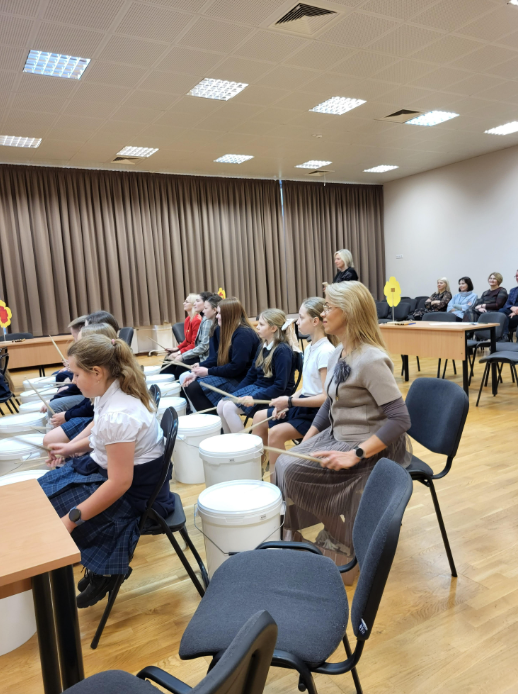 Popiet organizuotame renginyje pristatytas įspūdingas mokyklos pučiamųjų instrumentų orkestras. Ne mažiau džiaugsmo suteikė ir galimybė pačioms mokytojoms sugroti būgnų partiją.