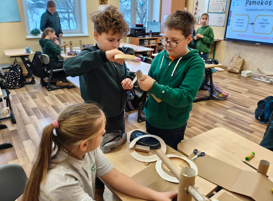4b klasės mokiniai tapo tikrais inžinieriais – iš antrinių žaliavų konstravo trasas, kuriomis turėjo riedėti kamuoliukas. Kartonas, popieriaus ritinėliai ar kitos panaudotos medžiagos virto kūrybiškais inžineriniais sprendimais. Kurdami trasas mokiniai planavo, bandė, klydo ir tobulino savo idėjas. Darbas grupėse ugdė ir bendradarbiavimo, komunikavimo bei atsakomybės įgūdžius. Ši veikla parodė, kad STEAM veiklos gali būti ne tik naudingos, bet ir labai įdomios.