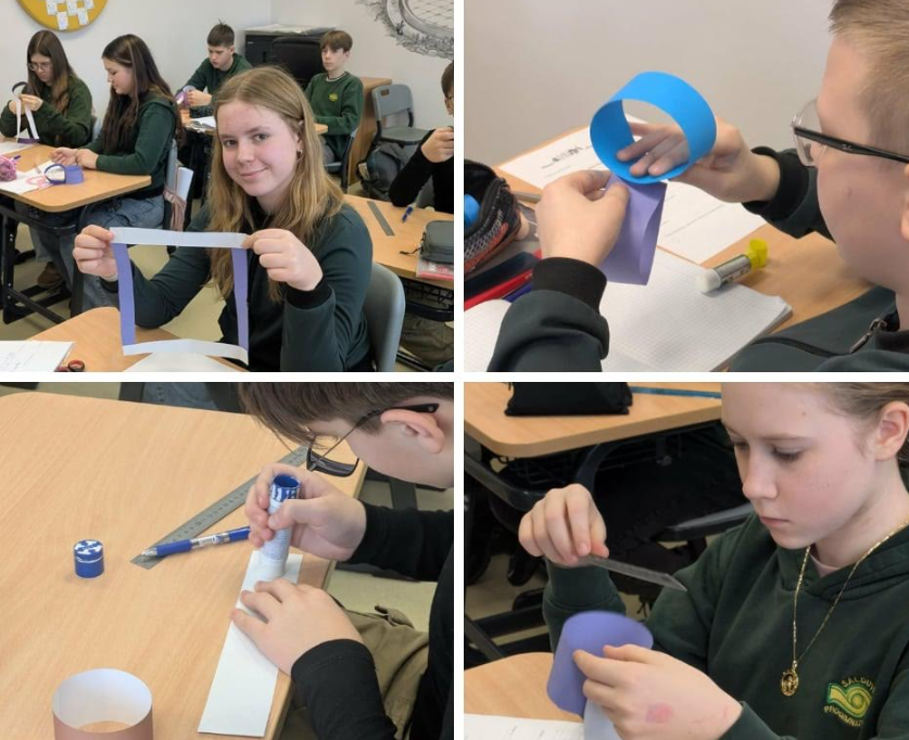 Pamokos metu mokiniai: suklijavo du žiedus vertikaliai vieną ant kito; apskaičiavo vieno apskritimo ilgį ir dviejų žiedų bendrą ilgį; kėlė hipotezę apie būsimos figūros perimetrą; nustatė, kokia geometrinė figūra susidaro; apskaičiavo gautos figūros perimetrą; palygino rezultatus ir suformulavo išvadas.