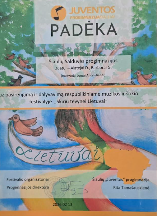 Salduvės progimnazijos 6 klasės mokinės Alatėja D. ir Barbora G. dalyvavo respublikiniame muzikos ir šokio festivalyje „Skiriu tėvynei Lietuvai“, kurį organizavo Šiaulių „Juventos“ progimnazija.