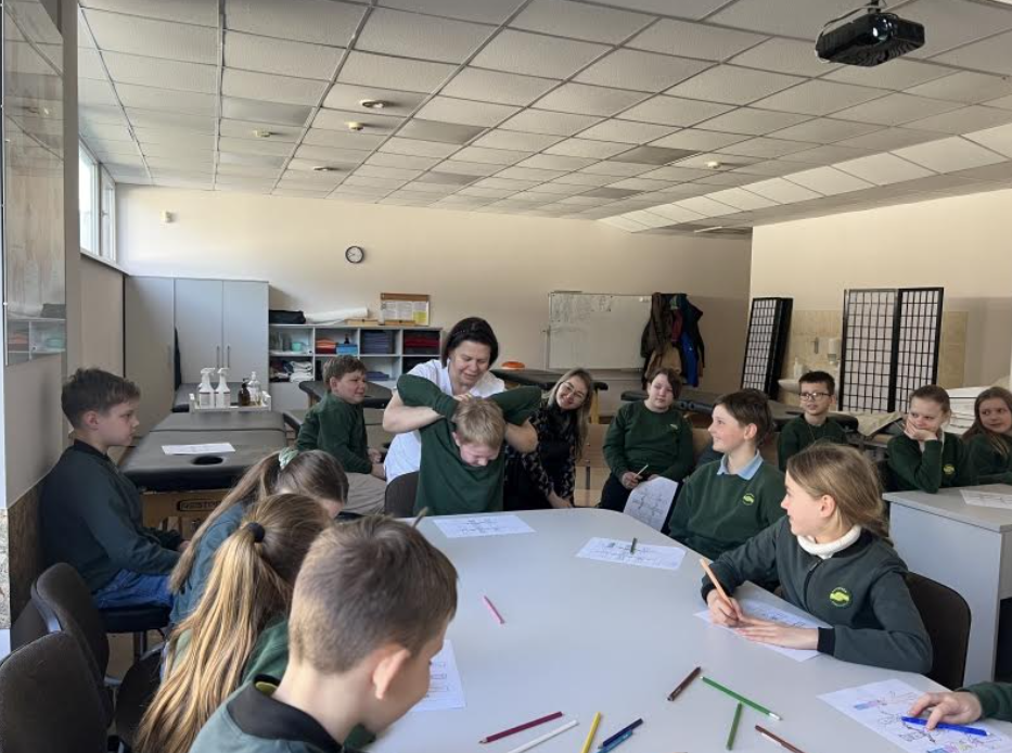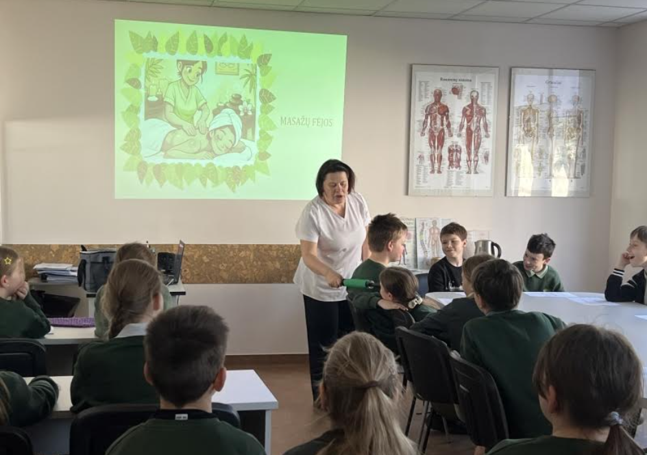 Edukacijos metu mokiniai susipažino su masažuotojo profesija, sužinojo apie masažo naudą bei subtilybes. Praktinėje dalyje vaikai mokėsi paprastų savimasažo technikų, aiškinosi, kaip galima padėti sau ir savo artimiesiems.