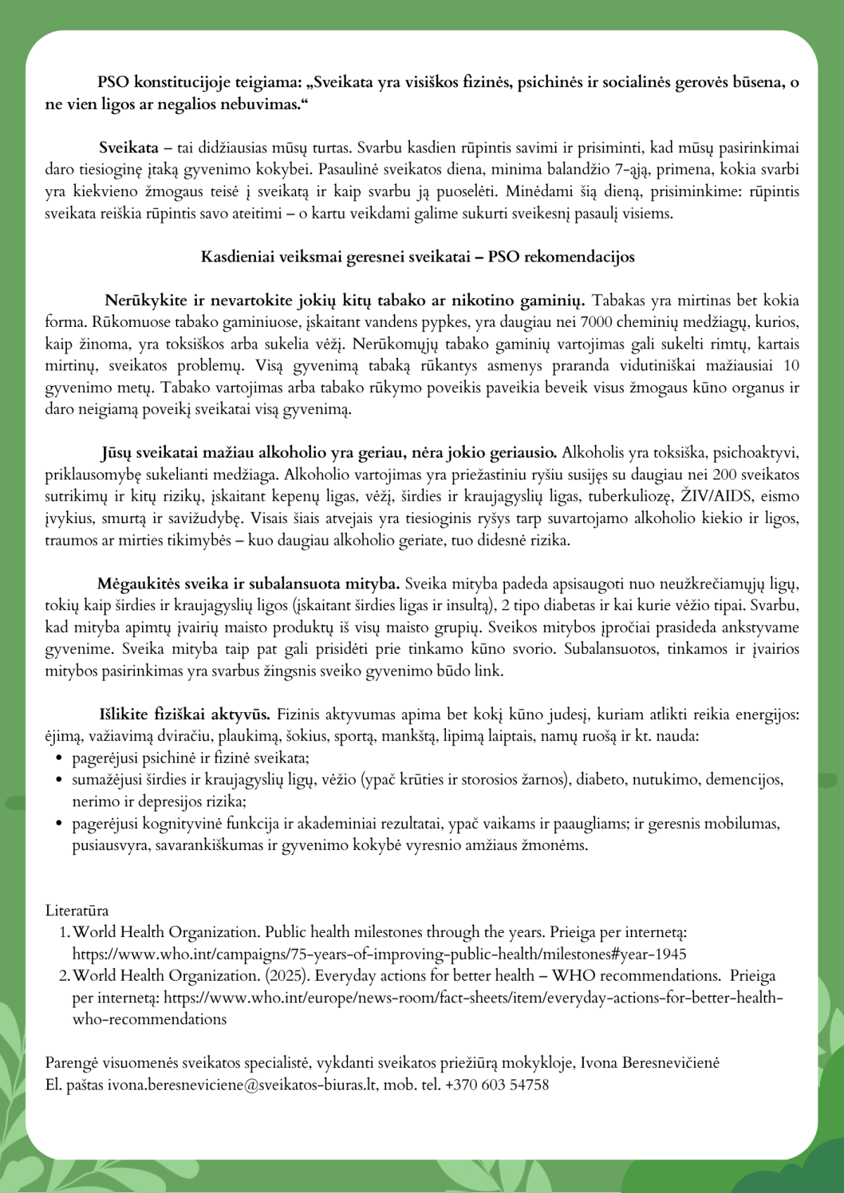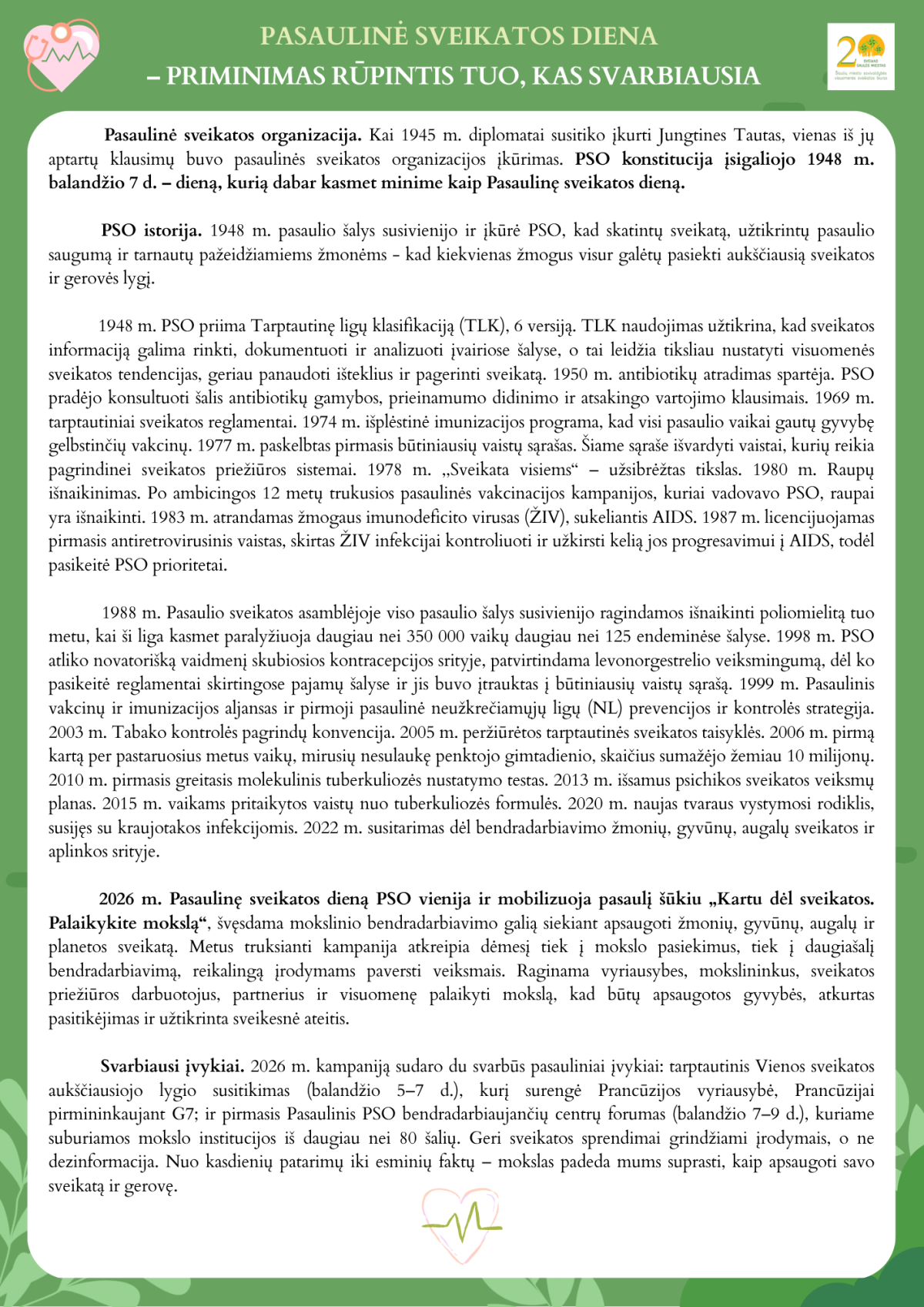 Prisegama publikacija apie Pasaulinę sveikatos dieną, jos reikšmę bei naudingi patarimai, kaip išsaugoti ir stiprinti savo sveikatą kasdien.