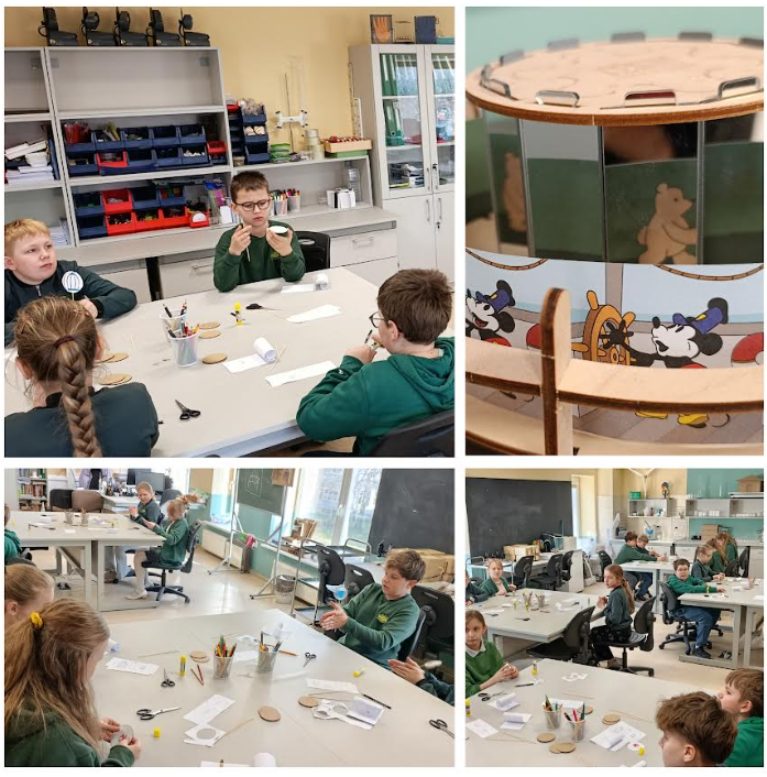 Ketvirtokai susipažino su naujomis sąvokomis – zeotropais, fenakistoskopais ir taumatropais, tyrinėjo jų veikimo principus bei patys galėjo išbandyti, kaip kuriama judesio iliuzija. Praktinės veiklos metu mokiniai pasigamino sukučius, kuriuos kūrybiškai dekoravo įvairiomis spalvomis, o vėliau stebėjo, kaip greitai sukant keičiasi vaizdas ir atsiranda optinė iliuzija.