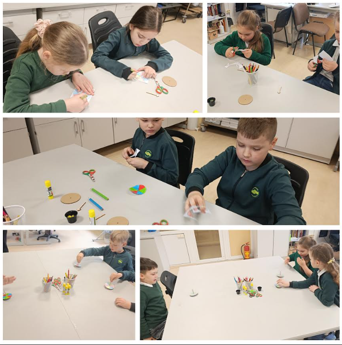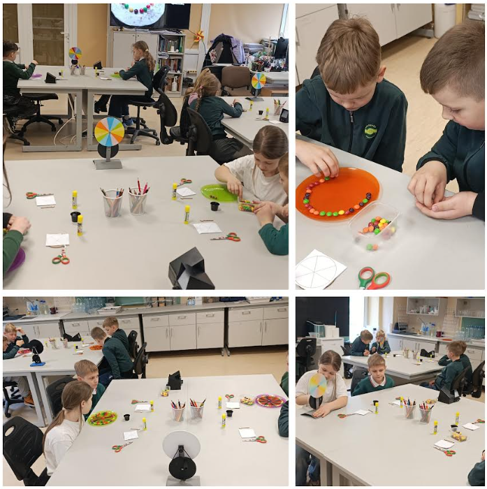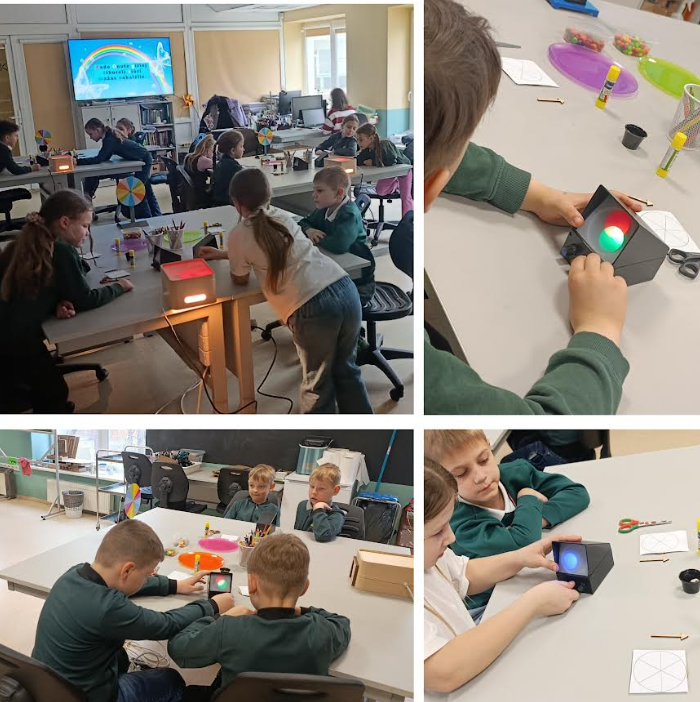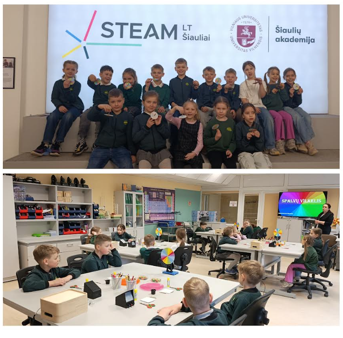 Pirmos klasės mokiniai jau puikiai atpažįsta daugelį spalvų ir žino, kad maišant jas galima išgauti įvairius naujus atspalvius. STEAM veiklos metu pirmokai diskutavo apie vaivorykštę – aiškinosi, iš kokių spalvų ji sudaryta, tyrinėjo šviesos kritimą bei jos skaidymą, stebėjo, kaip atsiranda vaivorykštė ir kaip susijungus spalvoms kinta matomas rezultatas. Linksmiausia veiklos dalis buvo spalvotų vilkelių gamyba. Juos sukdami mokiniai tyrinėjo spalvų maišymąsi: greitai besisukant vilkeliui, skirtingų spalvų šviesa atsispindi nuo spalvoto skritulio dalių, o mūsų akys, matydamos greitai besikeičiančius vaizdus, „sujungia“ spalvas į naujus atspalvius.