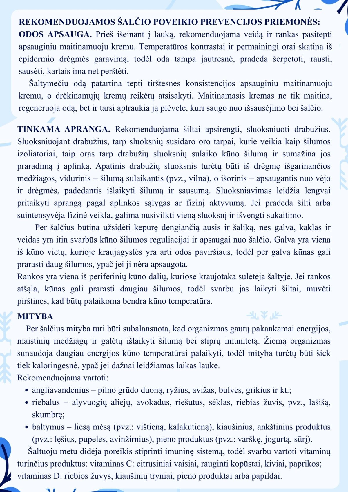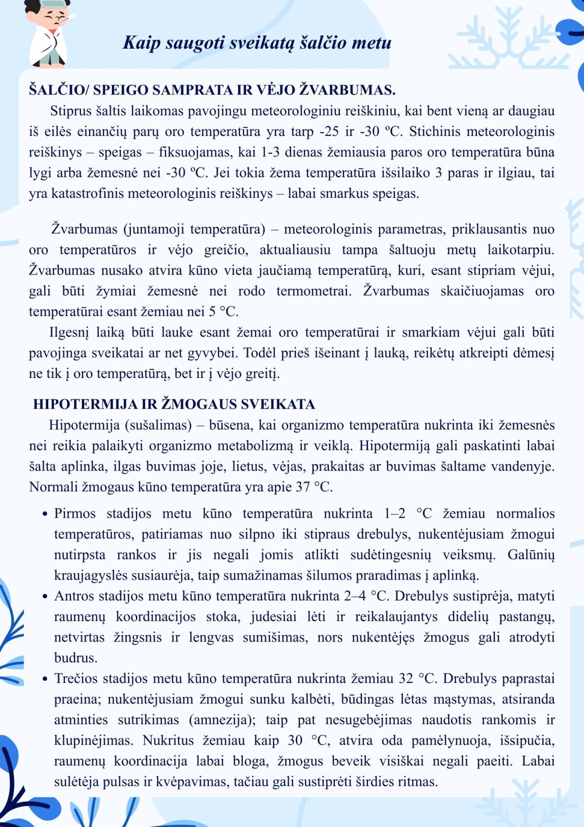 Ši tema ypač svarbi mokyklos bendruomenei, nes žiemą padidėja sveikatos sutrikimų ir traumų rizika, o žinios apie prevenciją padeda apsaugoti save ir kitus. Atsakingas elgesys, informuotumas ir paprasti kasdieniai sprendimai gali padėti išsaugoti sveikatą net ir didžiausių šalčių metu.