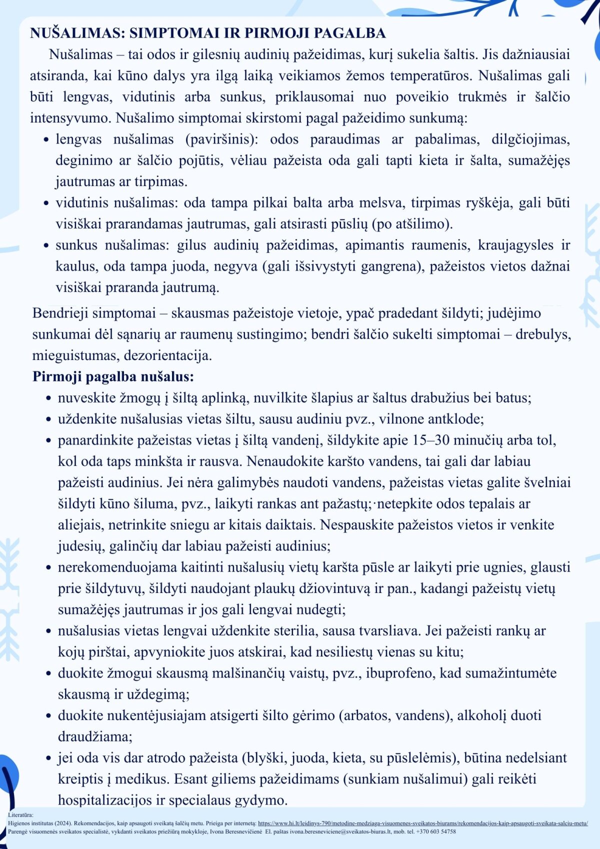 Ši publikacija „Kaip saugoti sveikatą šalčio metu“ skirta atkreipti dėmesį į itin aktualią temą žiemos sezonu. Joje pateikiamos aiškios ir naudingos rekomendacijos, kaip šaltis ir speigas veikia žmogaus sveikatą, kuo pavojingi nušalimai ir hipotermija, kaip jų išvengti bei laiku atpažinti pirmuosius požymius. Taip pat aptariama, kokia turėtų būti tinkama apranga ir mityba šaltuoju metų laiku bei kaip suteikti pirmąją pagalbą nušalusiam žmogui.