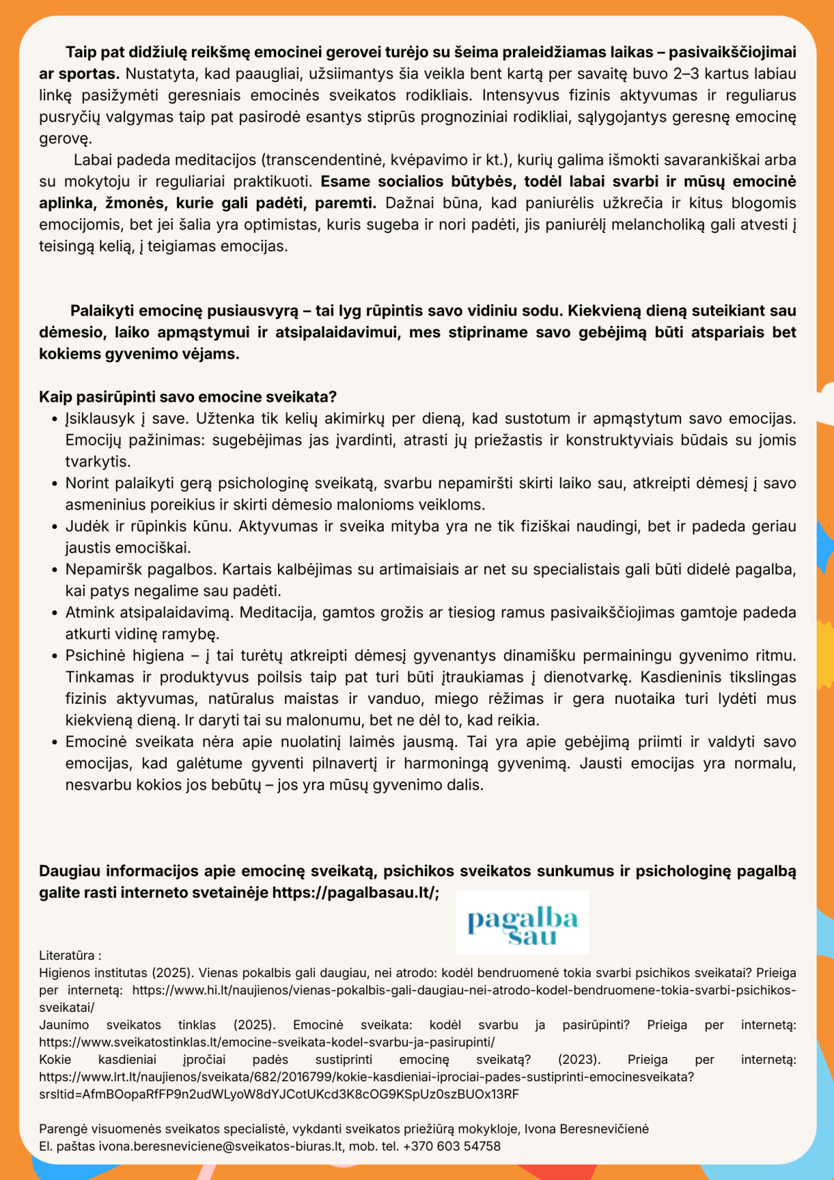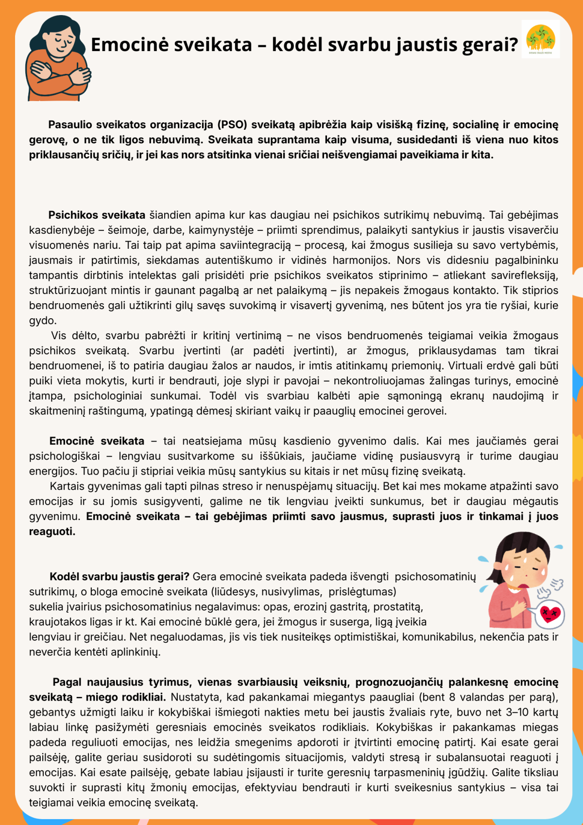 Ši publikacija skirta emocinės sveikatos svarbai ir jos reikšmei kasdieniame gyvenime. Joje paaiškinama, kad sveikata – tai ne tik ligų nebuvimas, bet visapusiška fizinė, socialinė ir emocinė gerovė. Aptariama, kas yra emocinė sveikata, kodėl svarbu atpažinti ir priimti savo jausmus bei kaip gebėjimas juos valdyti padeda lengviau įveikti iššūkius, stiprinti santykius ir išlaikyti vidinę pusiausvyrą.